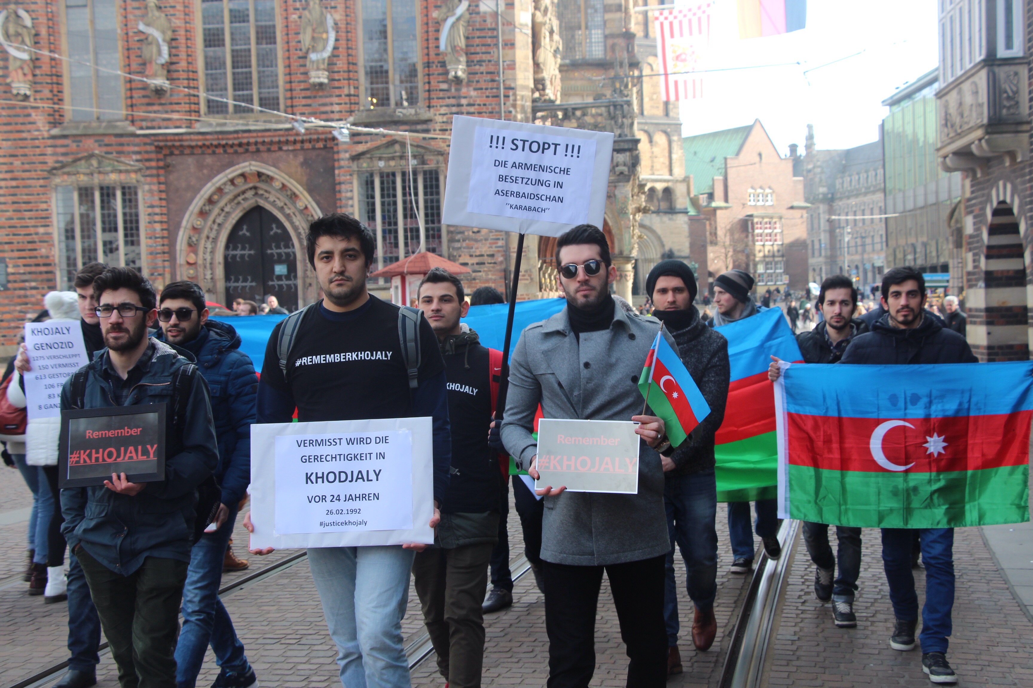 В Германии в городе Бремен группа студентов из Азербайджана провела акцию в связи с 24-ой годовщиной Ходжалинской трагедией. В акции участвовало 15 студентов, среди которых был один немец, сообщил minval.az студент из Бремена Санан Гусейнзаде.
