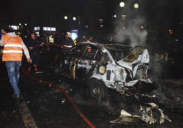 В центре столицы Турции взорвался автомобиль, начиненный взрывчаткой. На месте происшествия работают бригады скорой помощи и пожарные расчеты. Очевидцы говорят, что место трагедии напоминает ад.