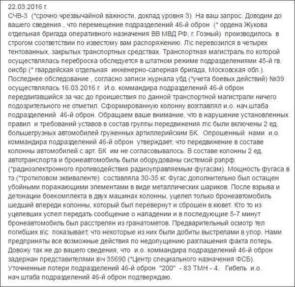 EuroAsiaNews опубликовал подробности того, что случилось под Донецком 21 марта, когда после подрыва фугаса пострадала колонна российской техники. По уточненным данным, погибли 83 военнослужащих 46-ой Грозненской отдельной бригады оперативного назначения ВВ МВД РФ. Причем такие потери стали следствием халатности руководства подразделения.