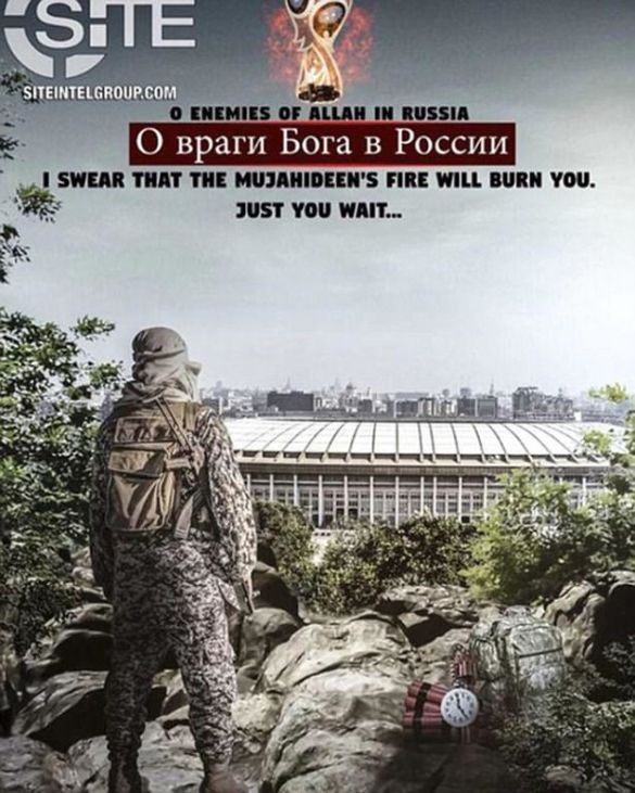 ИГ разработало еще один плакат, на котором террорист пытается подорвать стадион “Лужники” в Москве. Эти плакаты появились в Telegram и впоследствии были распространены Wafa Media Foundation.