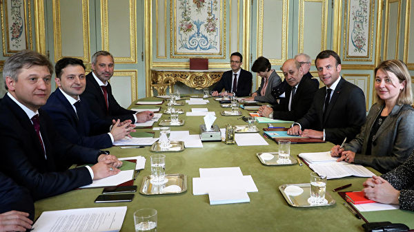 Встреча президента Франции Эммануэля Макрона с кандидатом в президенты Владимира Зеленского длилась около часа — сразу после нее в расписании президента было вручение верительных грамот послам.