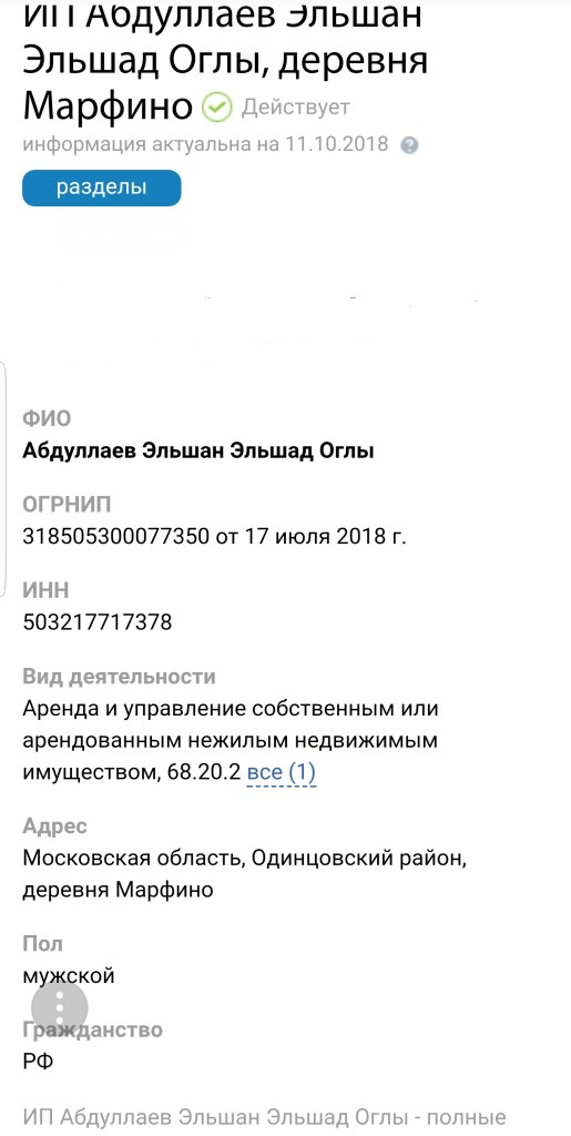 Так,Абдуллаев Эльшад Ислам оглы, 25.09.54 г.р. (Зарегистрирован в Московской области Одинцовского района, деревня Марфино, дом 26 В.), Паспорт гражданина Российской Федерации, серия 4611, номер 175161, выдан ТП в пос.Немчиновке ОУФМС России по Московской области в Одинцовском районе 14.01.2011 г. и Загранпаспорт гражданина Российской Федерации,серия 64,номер 3967781.