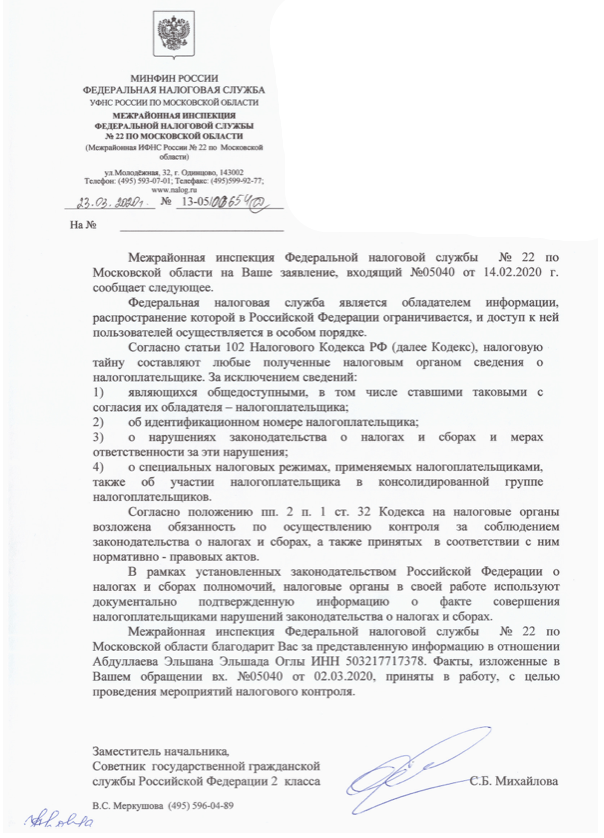 Когда мы смотрим на контрактные документы Эльшана Абдуллаева и армянкой Шаххрамановой Сусанной Шагеновной, ясно, что юридический адрес принадлежит квартире 26 B, расположенной на улице Марфино в Одинцовском районе Москвы, принадлежащей Эльшаду Абдуллаеву и его сыну Эльшад Абдуллаеву.