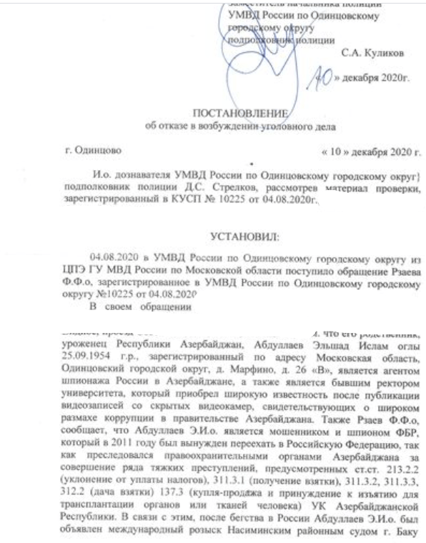 Эльшан Абдуллаев 10 декабря 2020 был доставлен с помощью сотрудниками полиции в Прокуратуру Одинцовского района и допрошен по поручению прокуратуры Москвы.