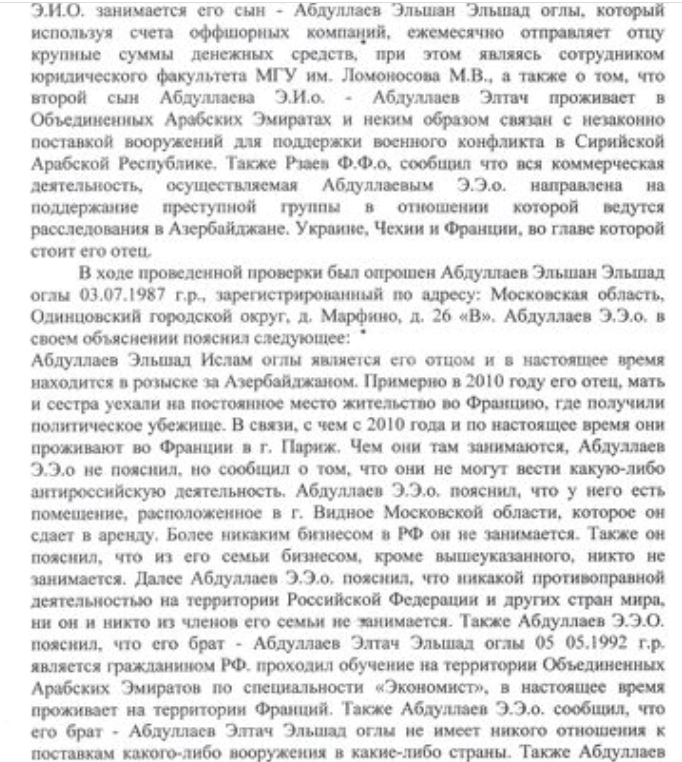 В ходе допроса в прокуратуре выяснилось, что младший сын Эльшада Абдуллаева, Эльтач Абдуллаев, является гражданином России и финансировал террористические организации против Сирии в Дубае. То, что мошенник Эльшад Абдуллаев везде говорит что якобы его сын Эльтадж Абдуллаев учился в университете во Франции, – это совсем неправда.