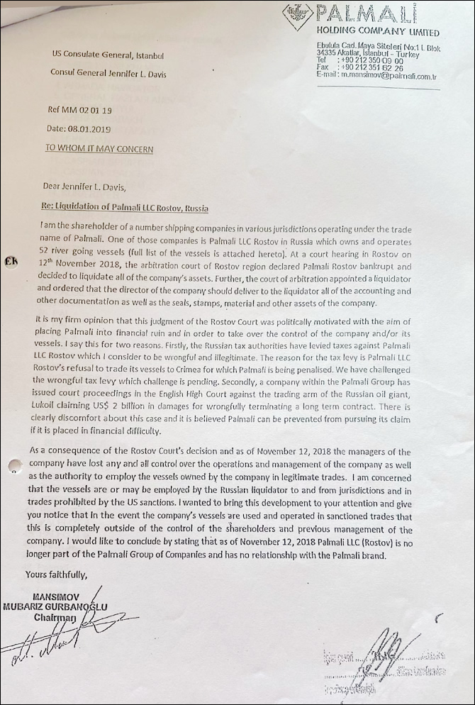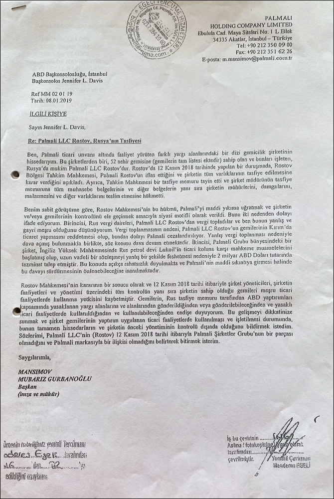 The petition, signed by Mubariz Mansimov Gurbanoğlu and addressed to the US Consul General in Istanbul, Jennifer L. Davis, stated that the Palmali Rostov LLC Company and the ships owned and operated by it were not under the control of the Istanbul-based Palmali Holding, and that the Arbitration Court of the Russian Federation appointed an inspector as trustee to the company. While it was stated that he was appointed, it was noted that “these ships are likely to sail to Sanction Countries imposed by the USA” and that Palmali Maritime and themselves cannot be responsible in this regard.