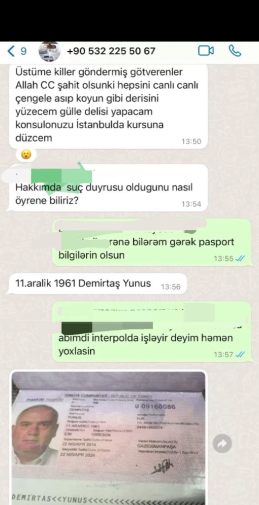 Yunus Demirtaş’s first target is the Azerbaijani consulate in Istanbul. In his voice recording and in a WhatsApp message sent to a person who does not want to give his name, he says that he will shoot up the consulate.