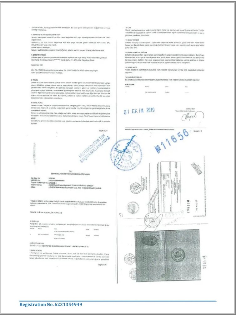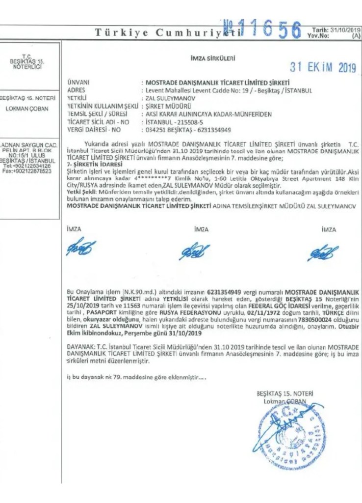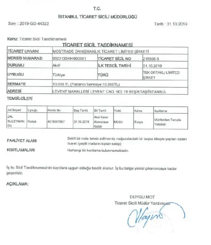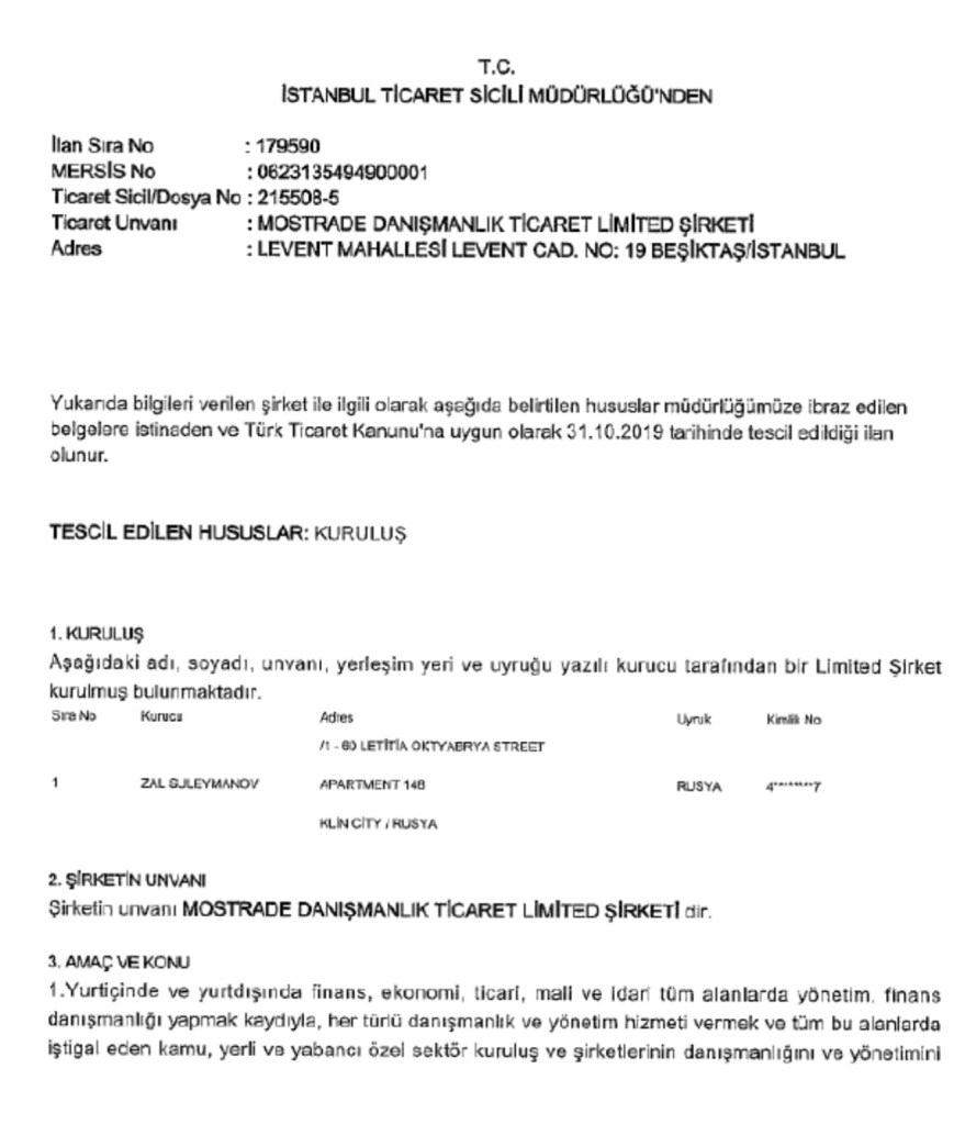 The company Mostrade Danışmanlık Ltd. (hereinafter Mostrade) was founded in 2020 in Turkey by Azerbaijani businessman Zal Suleymanov and was engaged in not very significant import-export operations, the total volume of which did not exceed one million dollars.