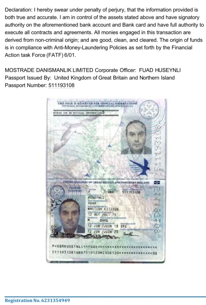 The company’s initial capital was declared at 10,000 Turkish lira (approximately $1,750 at the time), suggesting it was likely a front. The real owner is reportedly Fuad Huseynli, a British-Azeri dual national who is said to have set up the company under his driver Suleymanov’s name.