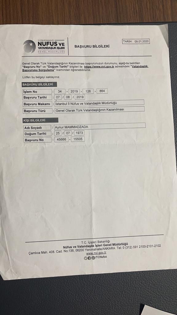 In the document we presented, Perviz Mammadzade wants to obtain Turkish citizenship by falsifying his wife’s documents, but Turkish law enforcement agencies are already aware of this issue.