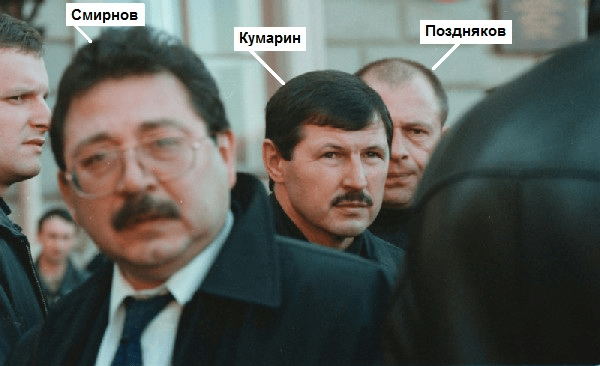 St. Petersburg, 1999. Vladimir Smirnov and Vladimir Kumarin (both vice-presidents of PTK at that time), followed by “Pozdnyak” (authority figure Georgy Pozdnyakov, killed in April 2000).