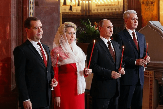 The famous photo on Easter 2013, when Medvedev came with his wife, and Putin with a friend.