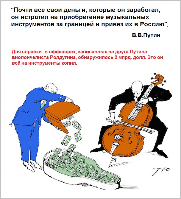 The stolen money was later found in parts in various corners of the world. And in 2016, part of it was found in the offshore accounts of cellist Roldugin. It turns out that Vladimir Vladimirovich does not disdain such a deal either…