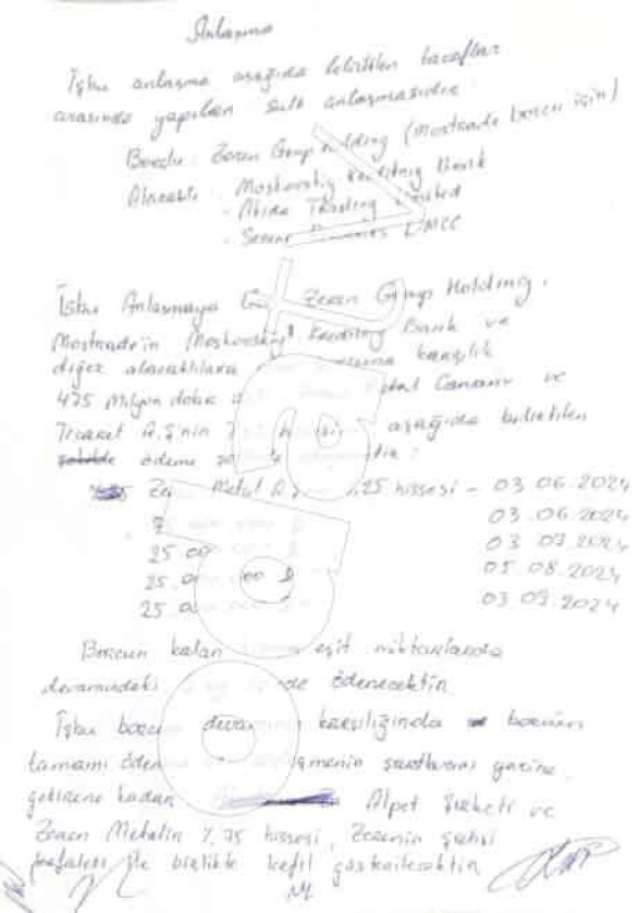 The note, included in the criminal complaint filed in Turkey, stipulates that Rıdvan Zeren agreed to repay $475 million in monthly installments and transfer 25 percent of the shares in the Zeren Group to the Moscow bank. As collateral for the debt collection, 25 percent of Zeren Group and 25 percent of Zeren Metal shares were listed in the note.