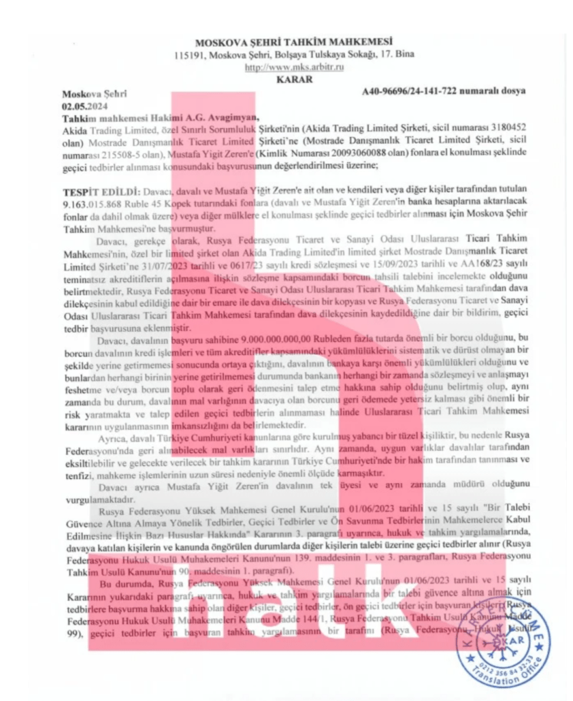 As a result, Moscreditbank filed a lawsuit with the Istanbul Public Prosecutor’s Office through its Hong Kong-registered subsidiary Akida Trading Ltd. against Mostrade Danışmanlık Ltd. and its owner Mustafa Yigit Zeren. The lawsuit states that the defendants failed to repay the bank’s loan debt of approximately $600 million.