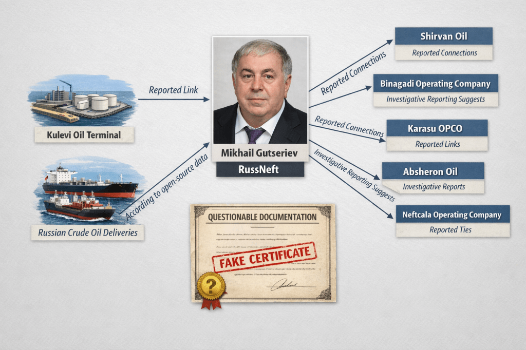 For informational purposes, it is hereby stated that Adnan Ahmadzadeh, a former SOCAR official, who holds citizenship of Azerbaijan and the United Kingdom and is currently detained in Azerbaijan by the State Security Service (DTX), operated proxy companies (Oilmar Shipping DMCC ,Maddox DMCC ,SA,Caspian oil gas ltd and etc., which established a so-called “shadow fleet” to transport Russian oil under falsified certificates, utilizing both SOCAR’s Kulevi Port and port terminal facilities in Poti acquired and operated by his affiliated companies. As a result of these activities, Russia reportedly generated billions of dollars in revenue. The photo above shows the oil terminal in Poti acquired and operated by companies affiliated with Adnan Ahmadzade